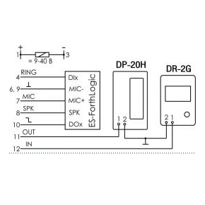 Модуль ES-DPH-1A предназначен для согласования контроллера с ES-Forthlogic домофоном. Если кто-то находится в помещении (дом не поставлен на охрану), то внешний и внутренний блоки домофона между сообой соединены по двухпроводной стандартной схеме. Из внешнего блока вызовы домофона поступают на внутренний блок. В том случае если в доме никого нет (режим охраны включен), тогда внешний блок домофона соединяется с голосовым каналом контроллера. Нажатием на кнопку вызова на внешнем блоке домофона, контроллером производится голосовой звонок на номер телефона абонента, заранее внесенным в телефонную книгу под номером 1.
