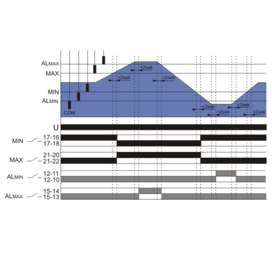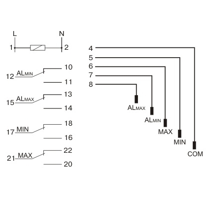 Принцип работы: реле поддерживает положение жидкости в заданных пределах. В том случае, если её положение окажется ниже МИН (электроды МИН и ЗАГ разомкнуты) — контакт реле МИН переключится в позицию 17-16 (работа НАПОЛНЕНИЕ), а контакт МАКС останется в позиции 21-22. По достижению жидкостью показателя МАКС (замыкаются электроды МАКС и ЗАГ) — контакт реле МИН переключится в позицию 17-18 (работа ОПУСТОШЕНИЕ), а контакт МАКС — в позицию 21-20. Аварийное состояние: Сигн.МИН (состояние ХОЛОСТОГО ХОДА) — в случае если уров.жидкости снизится до Сигн.МИН (разомкнуты электроды Сигн.МИН и ЗАГ) контакт Сигн.МИН переключится в позицию 12-11; Сигн.МАКС (состояние ПЕРЕПОЛНЕНИЕ) — при достижении Сигн.МАКС (замкнуты электроды Сигн.МАКС и ЗАГ) контакт реле Сигн.МАКС переключится в позицию 15-14.